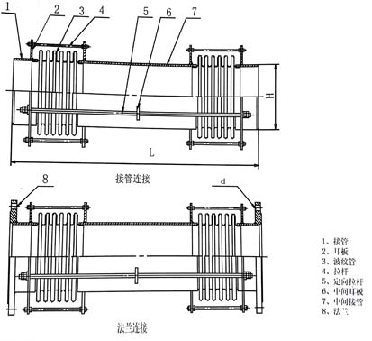 2.為了減少管架受力,可對此類膨脹節(jié)的每段波紋管在安裝前進(jìn)行軸向“預(yù)變形”,用戶需要時請在合同中注明。