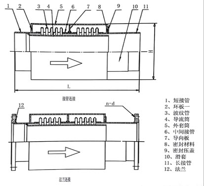 此類膨脹節(jié)的基本性能與軸向內(nèi)壓型波紋補(bǔ)償器相同,增加了外殼與導(dǎo)向環(huán),因此可直埋地下,同時(shí)該類膨脹節(jié)安裝簡單,其抗彎能力可以不考慮管道下沉的影響,廣泛用于補(bǔ)償熱力管道的冷熱變形。