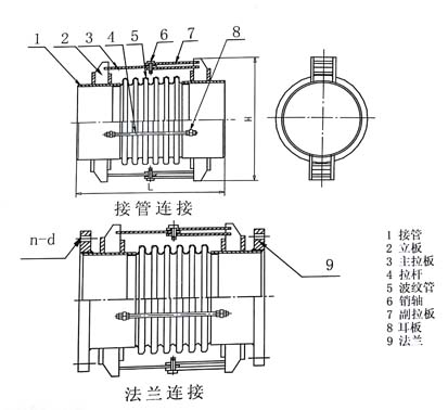 此類膨脹節(jié)由接管、波紋管及與接管相連的一對鉸鏈構(gòu)成。它只能吸收單平面的角向位移。吸收空間位移時應(yīng)該有兩個或三個角向型膨脹節(jié)組合使用。膨脹節(jié)的鉸鏈具有承受內(nèi)壓推力的能力。